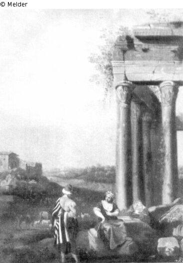 To the right, near the ruins of a port, is a woman seated on a rock, and a man in eastern clothing with his back to the viewer. To the left in the middle ground are fortress ruins.