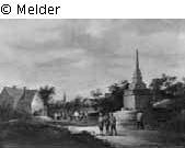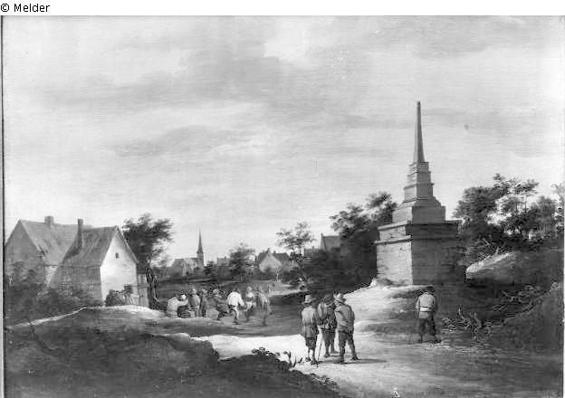 In the foreground, on the right, an obelisk towers, in front of which three farmers are talking to each other; furthermore, there is a dance in front of the tavern; in the background, one sees the village with the church.