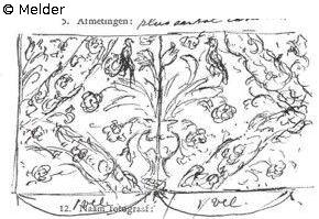 Parts of a leather wallpaper, arabesques, flowers in gold and colours
