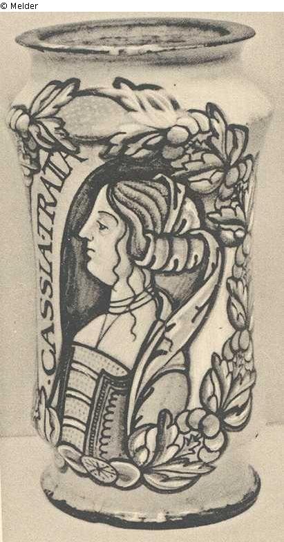 A PORTRAIT ALBARELLO brilliantly painted with a portrait of a lady in profile to dexter, in orange, yellow and blue, against a blue background, within a polychrome floral and fruiting wreath, inscribed on a label "CASSIA • TRATTA", Deruta, circa 1511
