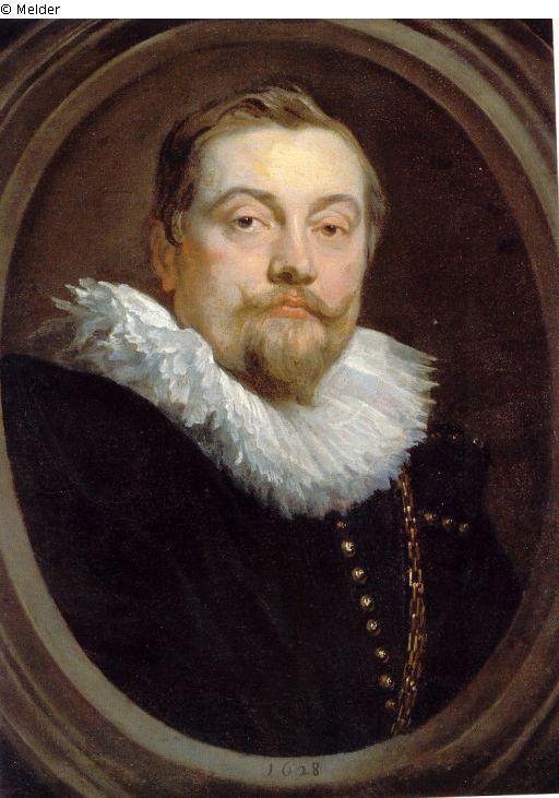 Innerhalb eines ovalen, grautonigen, profilierten Scheinrahmens dunklerer, bräunlich-grauer Grund. Dunkle Augen, helle Fleischfarbe mit lebhaften gelblichen Lichtern und grauen Schatten; das Rot der Haut tritt besonders kräftig am linken Ohr hervor. Haar braunblond, leicht meliert. Schwarzes Gewand mit goldenen Knöpfen und Goldkette. Weißer, stark abgetönter Kragen. Datiert unten im Profil der Rahmung: 1628.