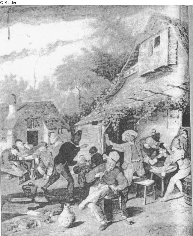 Pub garden with smoking, revelling and cardplyaing peasants