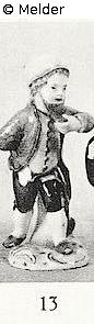 Fake goatee, jelly bag cap, purple skirt, yellow waistcoat, black breeches, red clogs. The left hand rised up, with the right he's holding the backside of the frock. Mark of swords. See auction catalogue collection Darmstädter, Nr. 19. Source: Hugo Helbing Kunsthandlung and Kunstversteigerungshaus: Kunstbesitz eines Berliner Sammlers. Katalog Nr. 49; Math. Lempertz'sche Kunstversteigerung: Eine bekannte Süddeutsche Privatsammlung and anderer Privatbesitz, Katalog Nr. 395.