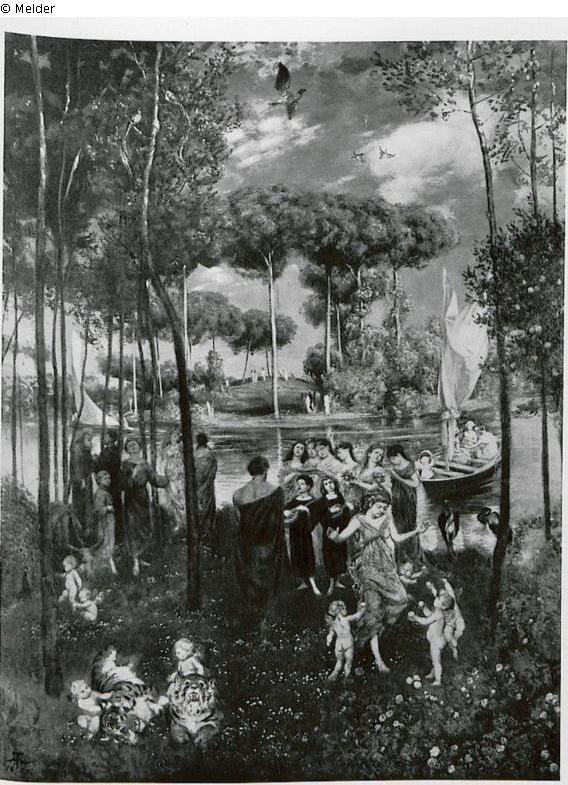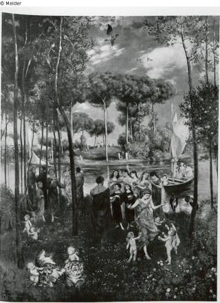 Arcadian meadow landscape with river course in which young, antique-like people are playing music under high pine trees. Deep blue cloudy sky. signed l. below: H. Th. 1879