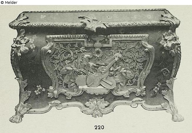 Wood cambared at all sides. Green varnish, plenty of mounting of (fire) gilded bronze. That is forming at all four sides cartouche-like panels, cutted "à jour" with scroll work on red ground; the filling in front is an applicated relief of music instruments. The mounting of the edges are scrollings of rocailles with masks above and claws below. (Covered with varnish.) Source: Hugo Helbing Kunsthandlung and Kunstversteigerungshaus: Kunstbesitz eines Berliner Sammlers. Katalog Nr. 49; Math. Lempertz'sche Kunstversteigerung: Eine bekannte Süddeutsche Privatsammlung and anderer Privatbesitz, Katalog Nr. 395.