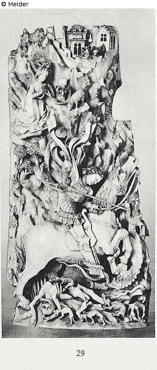 On horseback, killing a dragon with a lance, rearing up before him. On the ground a skeleton, gnawed by dogs. The knight with a short low-girdled coat of mail and flying straps at the shoulder. In background in scenery of rocky mountains, the king's daughter is praying on her knees; on mountains an armed castle. Figures nearly full-round with plenty undercuts. Source: Hugo Helbing Kunsthandlung and Kunstversteigerungshaus: Kunstbesitz eines Berliner Sammlers. Katalog Nr. 49.