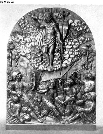 Im Vordergrund des Holzreliefs reich bewegte Gruppe der sechs Wächter, teilweise in Rüstung, die Gestalt des Salvator, auf Wolken stehend, von Engeln umgeben. Original Gold- und Farbenfassung, sehr ausdrucksvolle und bewegte Darstellung eines guten Meisters
