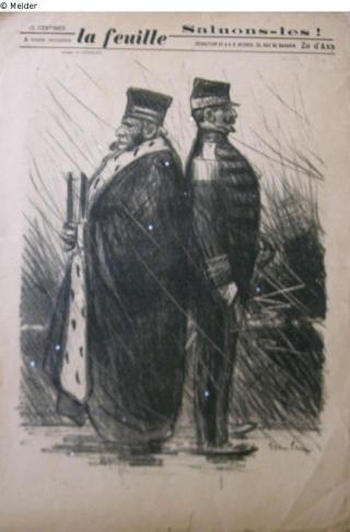 "Justiz und Generalität geben sich Rückendeckung in der 'Dreyfuß-Affäre'. Sinnbildlich haben sie sich aneinander gelehnt, ein feister Richter mit einer hermelinbesetzen Robe und einem dicken Gesetzbuch blickt scharf nach links, um weitere Verschwörungen aufzudecken. Der General hat die bessere Haltung und mit stolz geblähter Brust unterstreicht er seine Bedeutung. Beiden gemeinsam ist die antisemitische Einstellung." (UW)