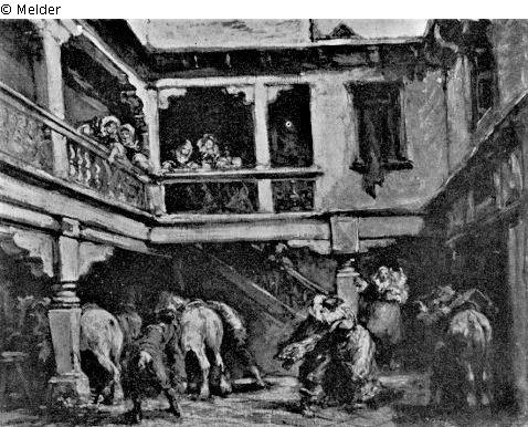Parke-Bernet: A palace courtyard with figures exclaiming from the balcony, a woman carrying a child descending the steps, another in rose embracing the returned warrior, a soldier in scarlet greeting the figures in the balcony; attendants unsaddle the horses. Signed at lower right E. ISABEY, and dated 1864. (Hanak) [Marginal:] 425. Exhibited at the Royal Hibernian Academy, Dublin, 1904-05
