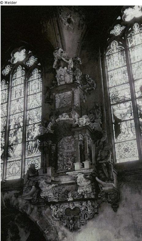 Strongly damaged during the World War II; [...]; partly rebuilt in 1952; loss of numerous relief and sculpture fragments, particularly parts of the main relief and top relief: fragments presumably lost or stolen during the post-war period; [...]; property of the Kulturstiftung Sachsen-Anhalt; whereabouts unknown.