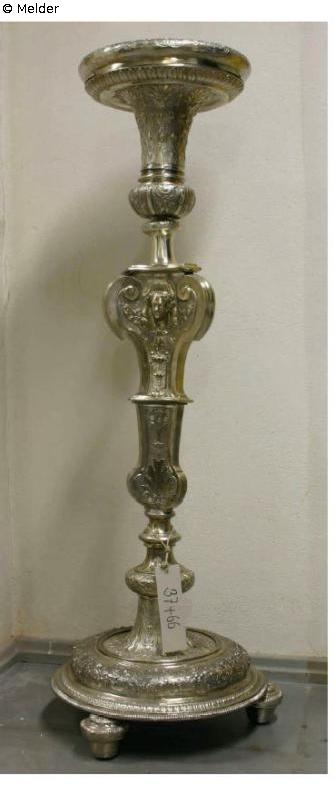 An elaborately decorated silver gueridon (representative mobile stand) from a formerly existing pair of gueridons. In the center a decorative element showing a (probably) male head. A round decorated plate located at the top.