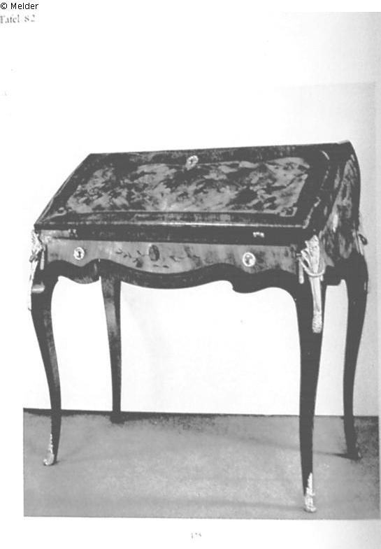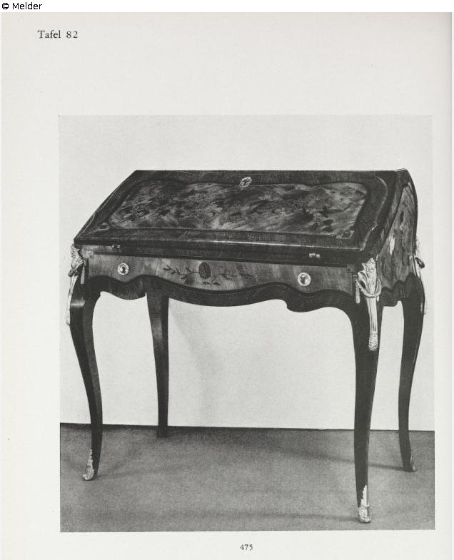 Louis XV; fruit wood, veneered and inlaid with coloured woods. Curved and bulbous shape (‘Dos d'ane’), the contoured frame transitioning into four curved legs. The writing surface, sides and frame feature rich floral marquetry, framed by ribbons. Inside, rich cabinetry with many drawers and compartments. With gilt bronze fittings: four herms with laurel garlands, two round discs with laurel wreaths, shoes. Potsdam.