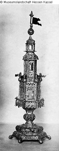 Depicting a flemish steeple with bell, on six claw feet, three storeys with gilded flag. Spice box in the basement, hexagonal with six small gilded flags, rich and solid filigree work.