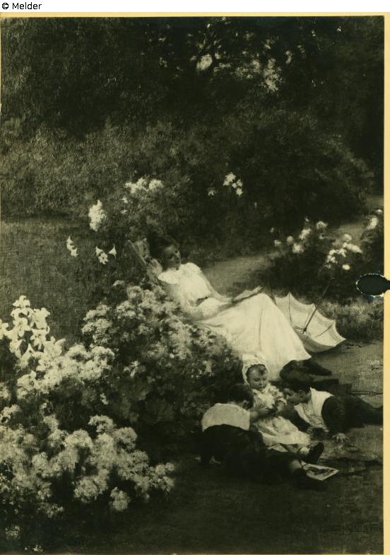 Panel painting: Picture: Park & children's games in nature & sitting on a rise (female figure) & reading & flowers & parasol