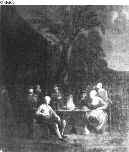 Outside a tavern beneath a tree are four men and two women at a table. On the table is a plate with fruit, bread, and a stein with beer.