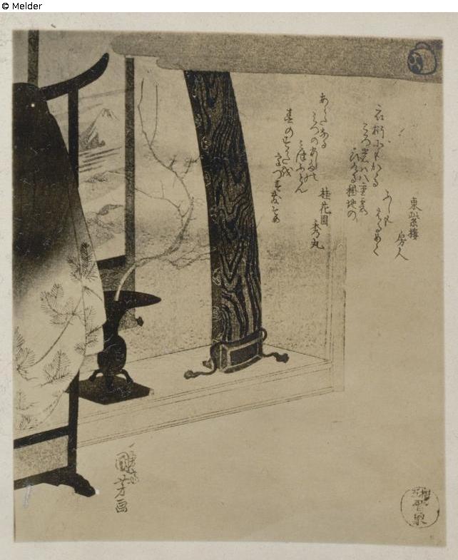 A fuji landscape kakemono hung in the niche; in front of it a bronze vase with a beautifully curved branch of flowers; next to it a koto with a splendid grain; in the foreground a stand with a pine-patterned robe laid across it.