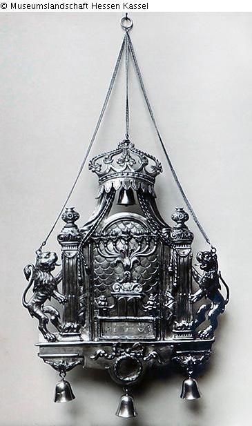 With chains, richly executed. Attached crown, cords, seven-branched candelabra, ark with tablets (of the Law), flanked by 2 columns and gilded lions, 4 bells. 5 small interchangeable silver plates to denote year. Silver mark.