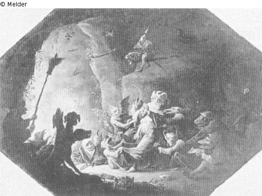 Panel painting: Depiction: Showing wealth & devil dragging the damned into hellfire; Wealth; Showing; Showing & devil; Satan; Dragging; Fire; Inscription lower right; Signature: D TENIER F; Dimensions: 55 x 70 cm