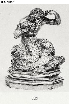 Riding on a turtle, the left rised up to the shoulder. Bronze, hollow casting, gold-plated. Octogonal pedastal. H. with pedestal 15 cm. Vgl. Planiseig, Venezianische Bildhauer, Abb. 467 and Dedalo, 1927, S. 559. Source: Hugo Helbing Kunsthandlung and Kunstversteigerungshaus: Kunstbesitz eines Berliner Sammlers. Katalog Nr. 49.