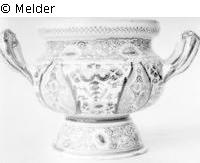 Tureen, faience, port-shaped, with 2 large handles, painted blue with floral and fruit ornaments. Bumped once at the base and once at the top, a crack at the upper edge.