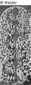Two altar wings, belonging to the so-called Gotha altarpiece (inventory no. SG 5): the genealogy of Christ, depicted as a winding vine, from which the individual persons grow like buds; one can find the ancestors from Adam to Solomon on the left and from Jesse to Mary on the right panel, with each person named on the leaves; additional title blocks on the central axis place Jesus's ancestors chronologically.