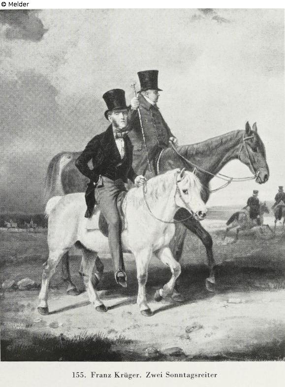 In front two riders, the Hagere on a pony, the Feiste on a fox, in the background further riders. Backside confirmation of authenticity by Prof. Dr. G. J. Kern. Comes from the Brose Collection. Cf. lithograph of Meyerheim No. 328 of the auction at the Galerie Fischer, Lucerne, of 21.03.1942. Cf. Weidmann: Franz Krüger, Fig. p. 31