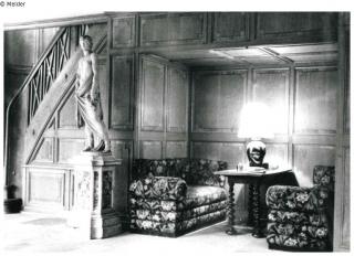 Innenansicht von Schloss Neumühle als Quartier der alliierten Besatzungsmacht 1945, Hausarchiv der Grafen von der Schulenburg-Wolfsburg, 920, Photograph: Erling J. Foss, Colorado Springs, CO, die Skulptur des Vertumnus vor dem Treppenlauf