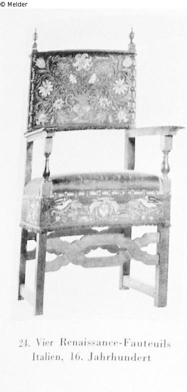 gerade Rück- und Armlehnen, durchbrochene Zarge, roter Seidenbezug auf Rücklehne und Leiste unter dem Sitz Seidenstickerei: Wappen, Blumenranken und Vögel; Quelle: Galerie Fischer: Große Kunstauktion in Luzern. Sammlung Frau Hermine Feist, Wannsee u.a. am 20., 21., 23. und 24. Mai 1941. Luzern 1941. Katalognummer 24; Auktionsvertrag zwischen Dr. Hans Feist und Dr. Theodor Fischer vom 28.10.1940, in: Nachlaß Feist, in: Literaturarchiv Marbach; Abrechnung [...] über die verkauften Nummern an der Auktion vom 20./24.05.1941, in: Nachlaß Feist, in: Literaturarchiv Marbach.