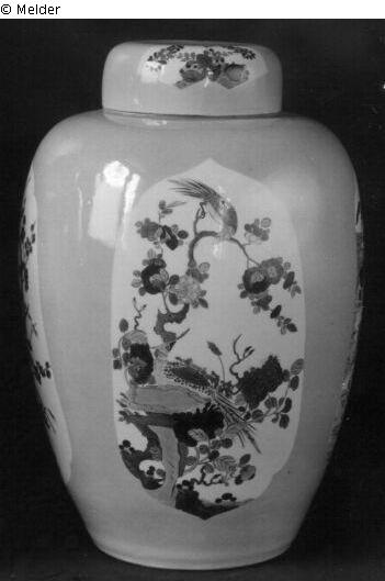 Footless, oval pot and cover, so-called ginger jar, with horizontal shoulder and short neck; flat cover without knob.