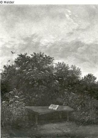Found-Object Report Garden bench with an open book in front of an elde Artist / Creator Carus, Carl Gustav Object type Painting Material / TechniqueOil ; Cardboard / paintedLost Art-ID565765
