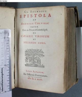 Found-Object Report Epistola ad Andream Colvium super Cap. XI. Primæ ad Corinth. Epist. De cæsarie virorum et mulierum coma Author Claude Saumaise Publisher Elzevir Object type Library objects Lost Art-ID622810