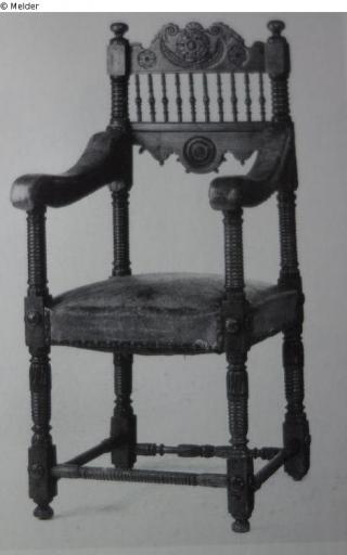 Found-Object Report Armchair Artist / Creator Unknown (Norddeutschland, Vierlande? / Northern Germany, Vierlande?) Object type Furniture Material / TechniqueWood ; Leather ; Metal / carved ; lathedLost Art-ID595150