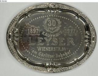 Found-Object Report Tray: 30 Jahre Kaufhaus Leyser Artist / Creator Unknown Object type Crafts and other folk arts Material / TechniqueMetal (Steel sheet) / engraved ; nickel-platedLost Art-ID618196