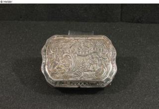 Found-Object Report Tobacco tin Artist / Creator Thomsen , Johann Hinrich Object type Container Material / TechniqueMetal ; Metal (Silver) / mounted ; repoussé ; engraved...Lost Art-ID626420
