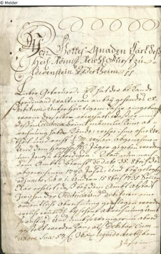 Found-Object Report Vorstellung des Ferdinand Waltmann an die löwensteinische Regierung zu Wertheim wegen Wegnahme von 1/2 Morgen Wiesen und Abgabe an den herrschaftlichen Jäger Object type Records and documents Lost Art-ID595937