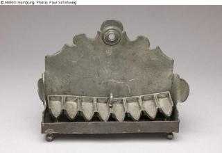 Found-Object Report Hanukkah candelabra Artist / Creator Johann Georg Auer, Rothenburg ob der Tauber, 1758 vermutlich spätere Serienfertigung Object type Ritual objects and equipment Material / TechniqueMetal (Lead) / castLost Art-ID626356
