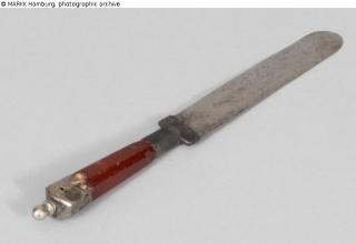 Found-Object Report Knife for shechita Artist / Creator Unknown Object type Ritual objects and equipment Material / TechniqueMetal (Steel) ; Wood ; Metal (Brass) / damascenedLost Art-ID626359