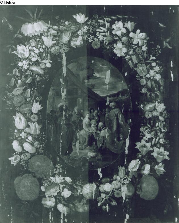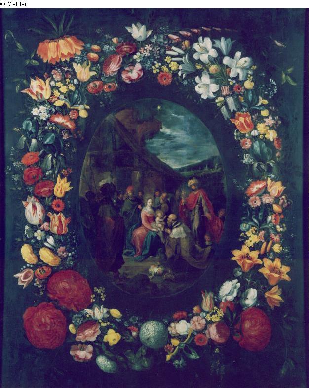 Anbetung der Heiligen Drei Könige, umgeben von einem Blumenkranz