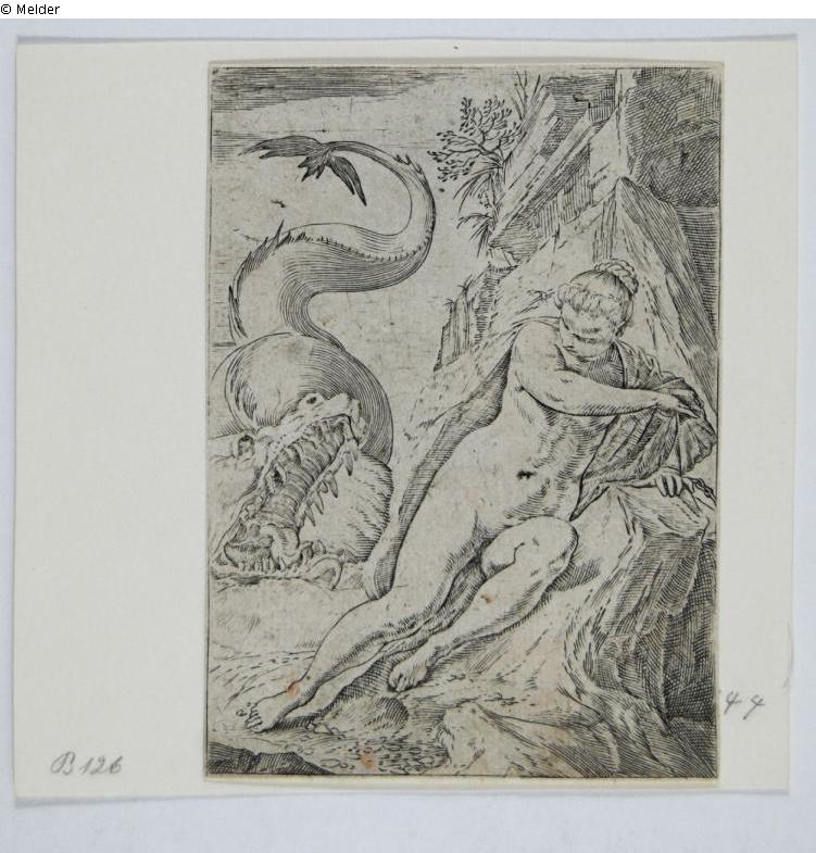 Nackte Frau an einem Felsen, links ein Ungeheuer.
