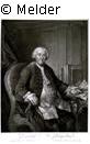 In einem Lehnstuhl sitzt ein Herr mit weißer Perücke. Links neben ihm steht ein kleiner Tisch. Auf diesem Tisch liegen mehrere Papiere.