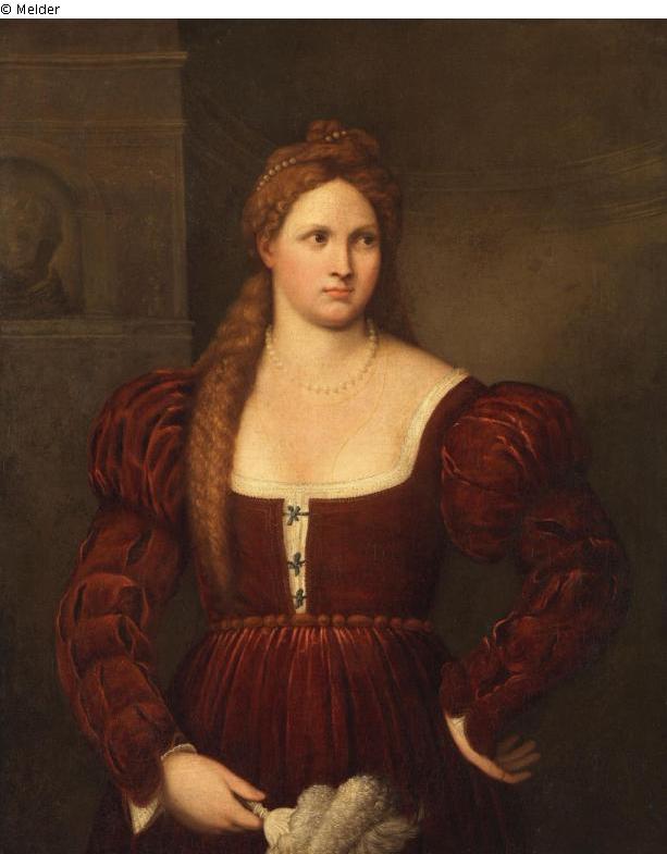 Kniestück. Junge Dame in rotem Samtkostüm mit Puff- und Schlitzärmeln und engem Mieder. Im weiten Dekolleté weißer Spitzensaum. Weißen Wedel in der Rechten haltend. Blondes Haar mit Perlenkette hochfrisiert und über die rechte Schulter fallend. Halsperlenkette und braune Hüftkette. Blick nach rechts. Grüngraue Halbrundnische und links Pfeilernische mit Kindern. Rückseite: Gal. Zinckgraf 21300.