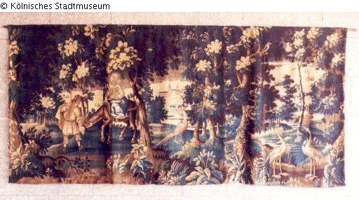In (Ideal-) Landschaft mit Bäumen und Buschwerk, Fasan und Flamingos, Maria mit Christusknaben auf dem Esel reitend geführt von Josef (aus der Bildmitte heraus nach links). Querformatige Komposition. In der Art einer Verdure in grünen und blauen Farben. Gelbe Seide. Keine Randbordüre. Architekturdarstellung mittig im Bildhintergrund.