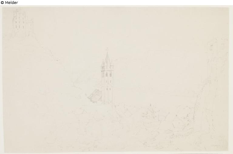 Blick von der Höhe auf Welmich mit Burg Maus und Rheintal