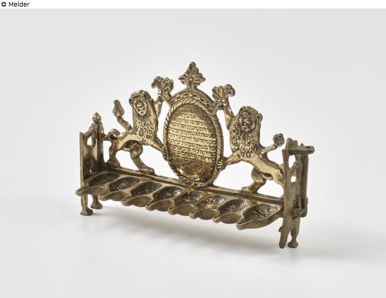 Acht flache Mulden für die Lichter. In der Mitte der Rückwand ovaler Schild mit drei hebräischen Segenssprüche (Berachot zum Anzünden des Leuchters), von zwei Löwen gehalten.