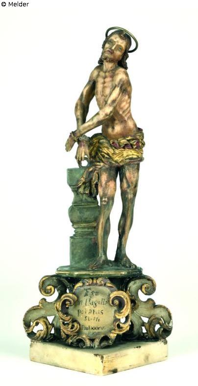 Vollplastische Skulptur aus Alabaster. Auf quadratischer, über Eck gestellter Platte erhebt sich ein polygonaler Sockel, beidseits nach außen geschweifte, durchbrochene Voluten. In der Mitte ovale Kartusche von Palmetten und Voluten umrahmt. Die schlanke Gestalt Christi steht gezeichnet von den durchlebten Qualen mit linkem Stand- und rechtem Spielbein, die linke Hüfte ausgebogen, der Oberkörper nach links gedreht, der Kopf nach rechts geneigt. Die überkreuzten Hände sind mit Seilen an einer balusterförmigen, vierkantigen Geißelsäule fixiert. Fassung: Inkarnat Christi bräunlich, Augen blau, Haare dunkelblond; Palmetten des Sockels und der Kartusche sowie das Lendentuch vergoldet; Sockel und Säule grau, Standplatte dunkelgrün. Auf der Kartusche in Tinte: Ego in Flagella potatus sum Psal XXX VII F XVIV; rückseitig signiert: A H