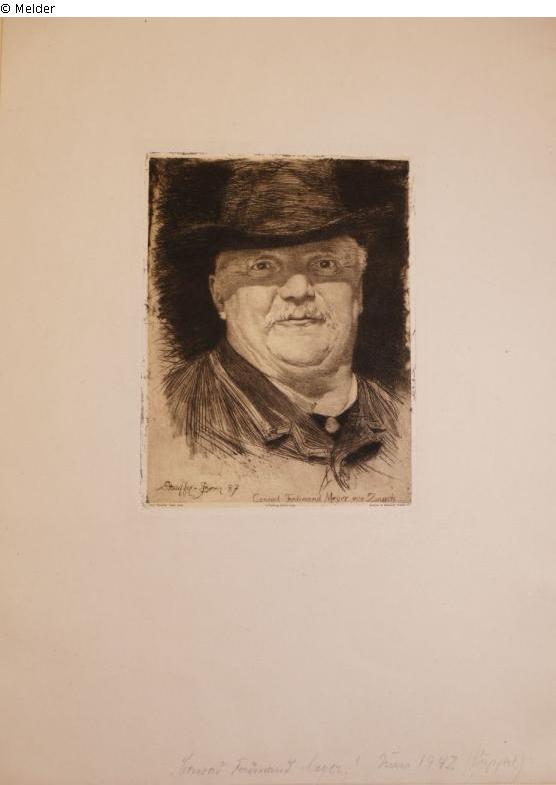 In der Platte signiert, datiert unten links: Stauffer-Bern 87; bezeichnet unten: Conrad Ferdinand Meyer von Zurich; darunter gedruckt unten links: Karl Stauffer-Bern fecit; unten Mitte: O. Felsing, Berlin impr.; unten rechts: Amsler & Ruthardt, Berlin W.