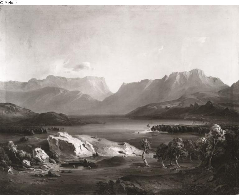 Befund Rückseite: bezeichnet links unten "C. Rottmann", Leinwand doubliert, Keilrahmen oben links in Blau "XR 4/3u" [Standort Meiserstr.], oben mittig rechteckiges, weißes Schild mit Maschinenschrift: "Transport 2.10.46 / Julius Streicher / Schloss Egg", daneben in Blau "38166" [Münchner Nummer], halb darauf geklebt ein ovales Ausstellungsetikett "The Council of Europe, The Romantic Movement, London 1959, Owner: Bayer. Staatsgemäldesammlungen, München", Catalogue No. 302, Country of Origin: Deutschland, Titel of Work: Blick auf das Tennengebirge, Artist: Carl Rottmann", links unten Etikett BStGS "Inv. Nr. 12032", Rahmen oben links in Weiß "R", daneben in Schwarz "8173" oder "8/73", mittig auf dem Kopf stehend "3 Re", rechts kaum sichtbar in Schwarz "5099" oder "5022", Rückseitenschutz oben mittig, auf dem Kopf stehend "3 Re", darunter Abrissspuren von kleinem rechteckigen Etikett, rechts mittig links kleines, weißes, rundes Schild, darauf handschriftlich in Schwarz "392", unten links Etikett BStGS "Inv. Nr. 12032"