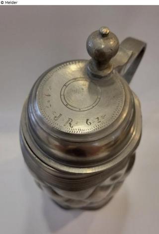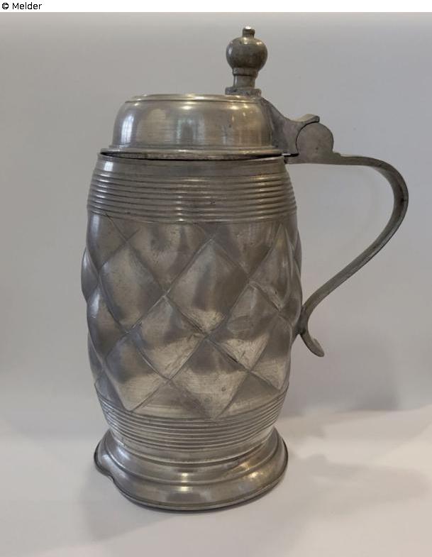 Deckelkrug aus Zinn; Deckel mit Scharnier an Henkel befestigt; umlaufend getriebenes Rautendekor, gerahmt von Liniendekor; Zinnmarke an der Deckelinnenseite: "S.W. Feinzinn" in Blattkranz mit Krone; auf dem Deckel Gravur "17 J R 62"