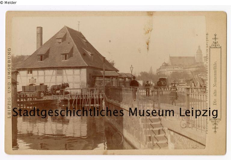 Sepia-Abzug auf Fotopapier auf Pappe, dargestellt ist die Nonnenmühle, davor steht ein Pferdefuhrwerk, im Hintergrund ist die Thomaskirche sichtbar. bez. u. r. (geprägt): Herm. Vogel / Leipzig.; Fotopapier: Ansicht der alten Nonnenmühle. bez. u. l. (geprägt): 1890; Pappe: bez. m. l. (Druck): Leipzig und Umgebung; bez. m. r. (Druck): Photographie und Verlag von Hermann Vogel in Leipzig. / Die alte Nonnenmühle.