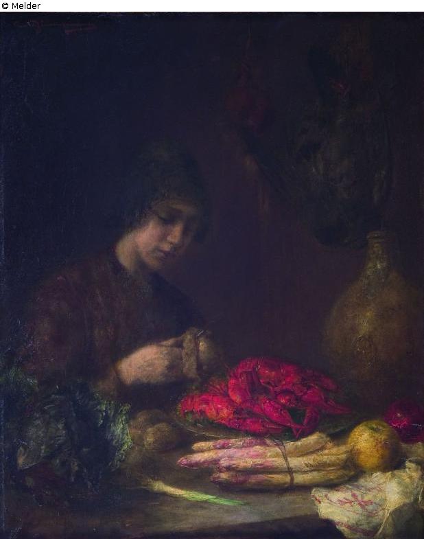 Frau bei der Küchenarbeit; Signatur o. l.: Ernst Zimmermann; Aukt.-Kat.: Kunstsalon Paul Cassirer [Hrsg.]; Hugo Helbing [Hrsg.]: Sammlung Schmeil, Dresden: Versteigerung ... 17. Oktober 1916 ... in der Galerie Paul Cassirer, Berlin ... Ausstellung: in der Galerie Hugo Helbing, München ... vom 8. bis einschliesslich 25. September 1916 ... [und] in der Galerie Paul Cassirer, Berlin ... vom 3. bis einschliesslich 16. Oktober 1916 ... München, 1916, S. 30, Tafel 141; Aufkleber "Herrn / Schmeil / Dresden"; Aufkleber "Hermes. / No 2179 / Frankfurt a.M."; Aufkleber "LaRoche / No 92".